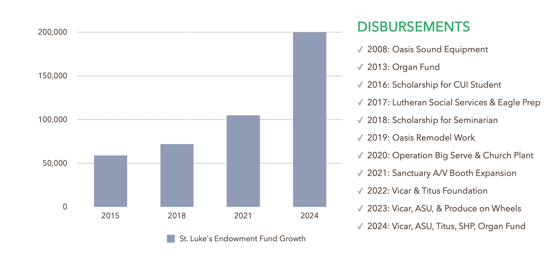 The St. Luke Endowment Fund provides regular support for church worker scholarships, campus improvements, and outreach opportunities. And best of all, this support continues for generations to come! For more information, click here for the brochure, or contact our church office.